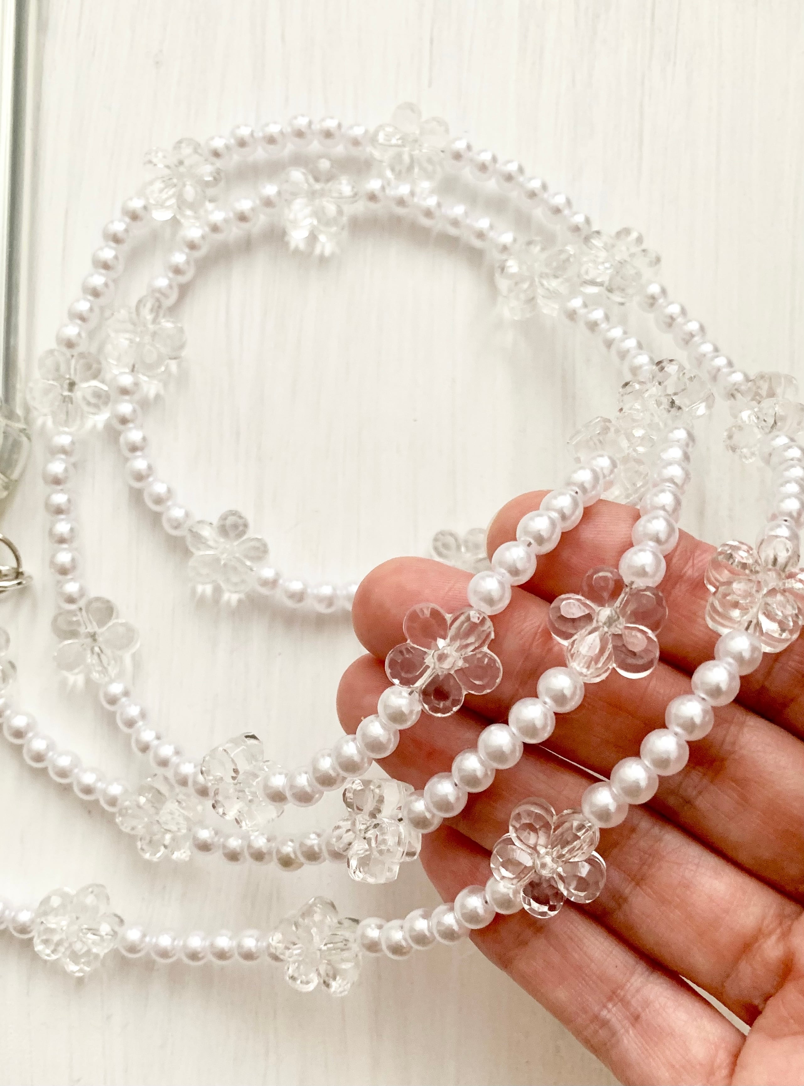 お花モチーフで心を華やかに:サンカヨウのクリアビーズとパールビーズを組み合わせたおしゃれなショルダーストラップです。お花のデザインが独自の魅力を放ち、日常の手元にさりげない彩りを添えます。