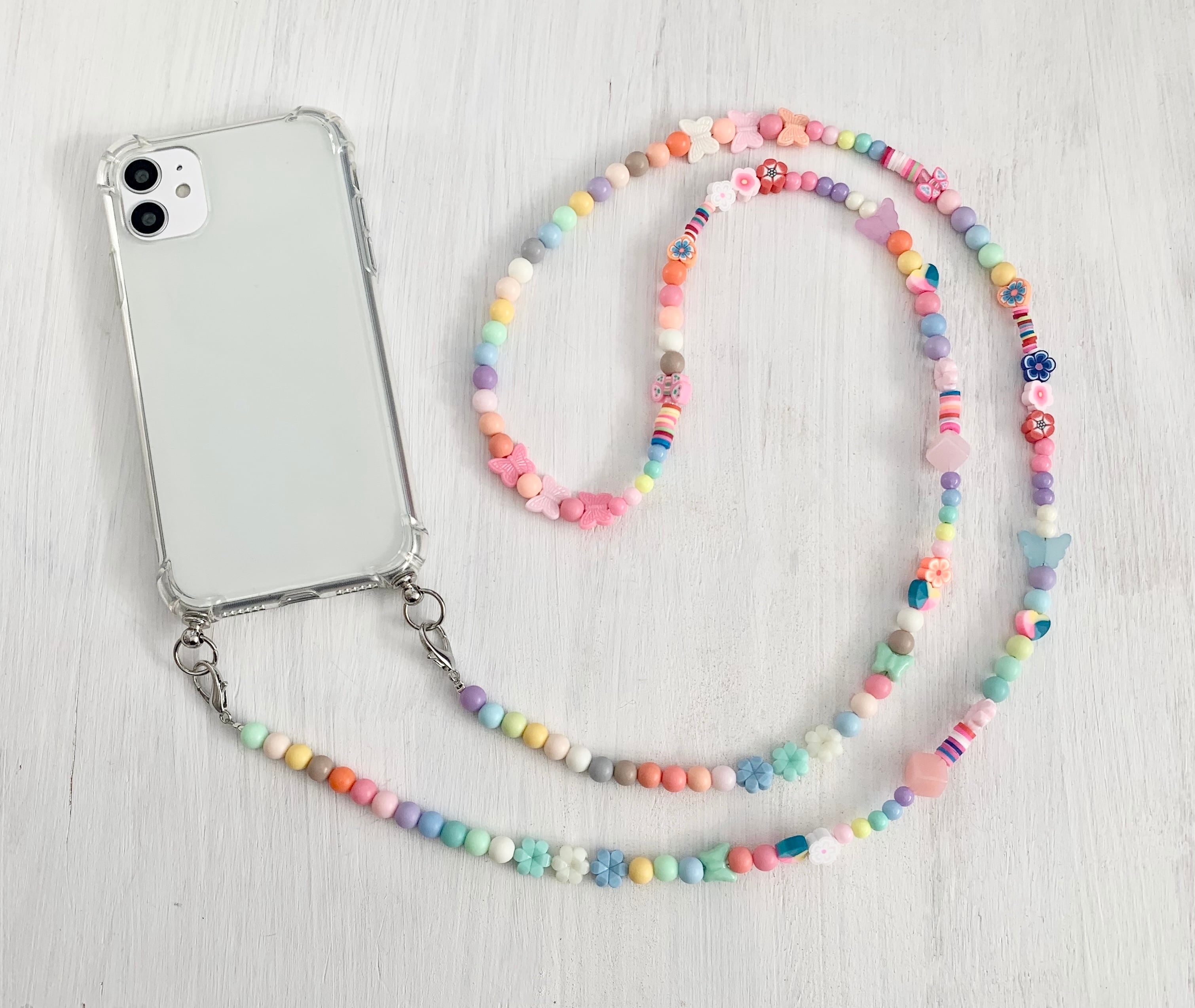 色鮮やかなビーズを使用してストラップ作成しました。バタフライ、お花、ハート、キューブなどのビーズを使用しこれからの季節に向けてカラフルに仕上げました。