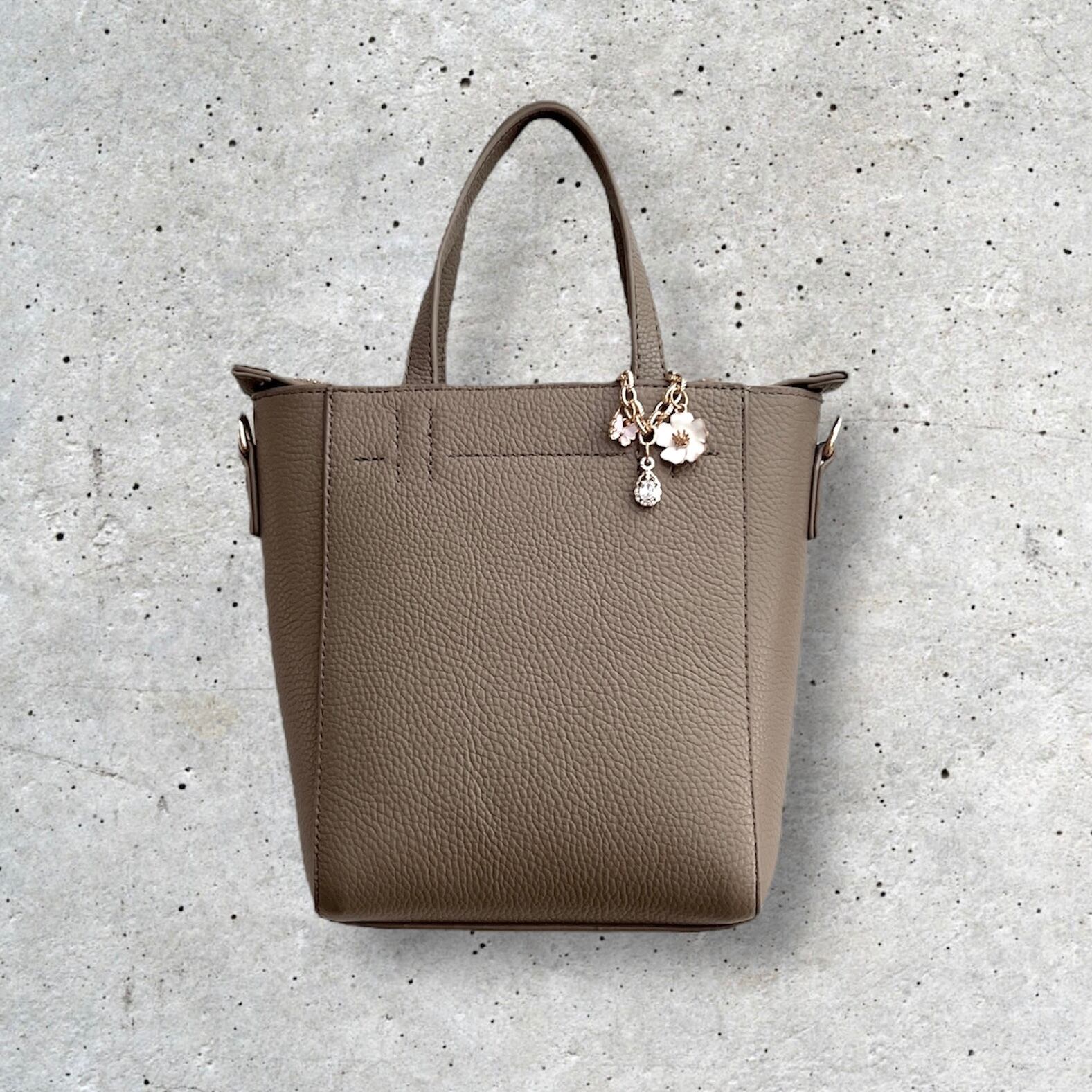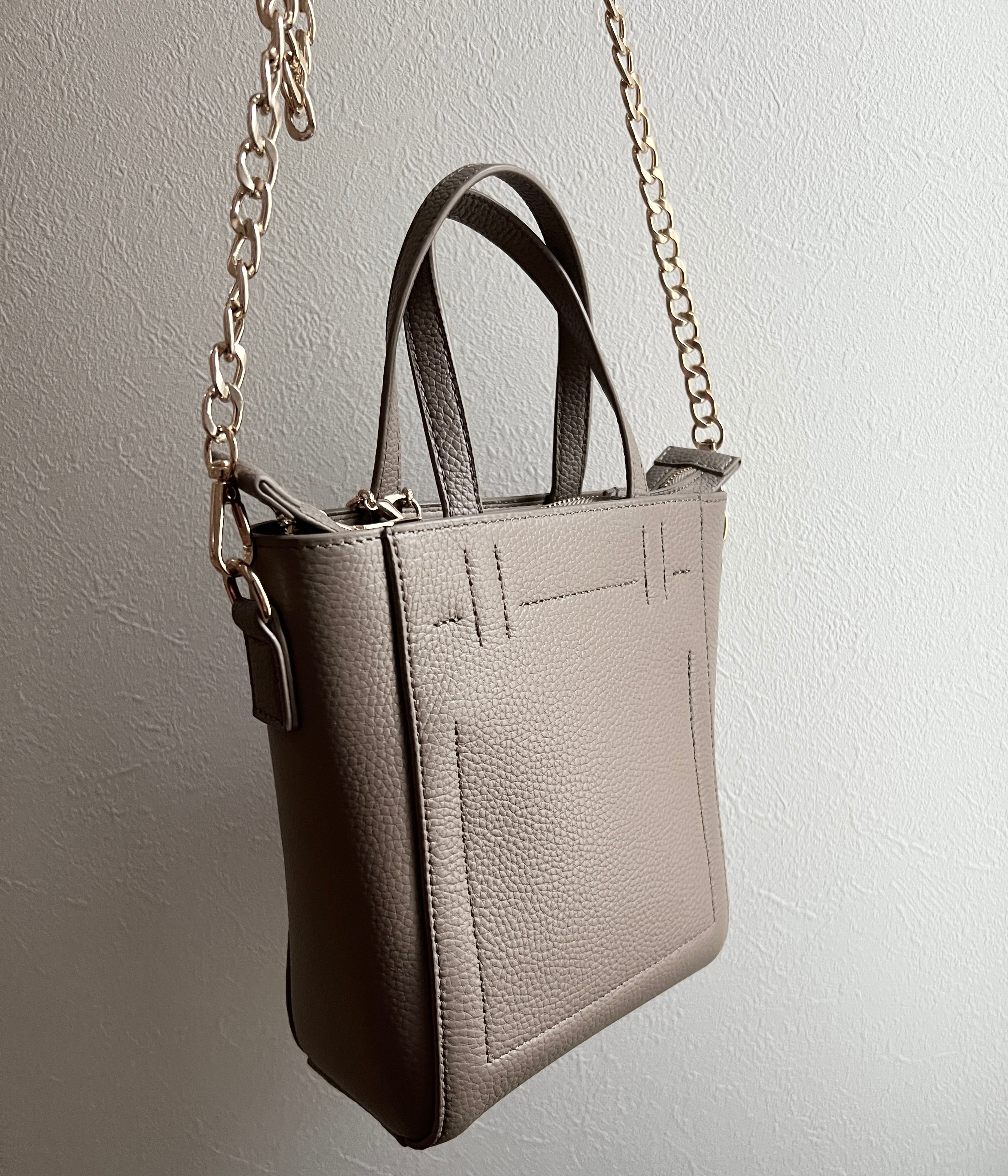クラシックな美しさとモダンなエレガンスを纏うゴールドチェーンの牛革トートバッグです。日常スタイルを一段と上品に。ゴールドチェーンとラインストーンのバッグチャームが華やかさを演出します。バッグチャームは3種類、オプションにて帽子クリップやゴールドチェーンの延長もご選択が可能です。