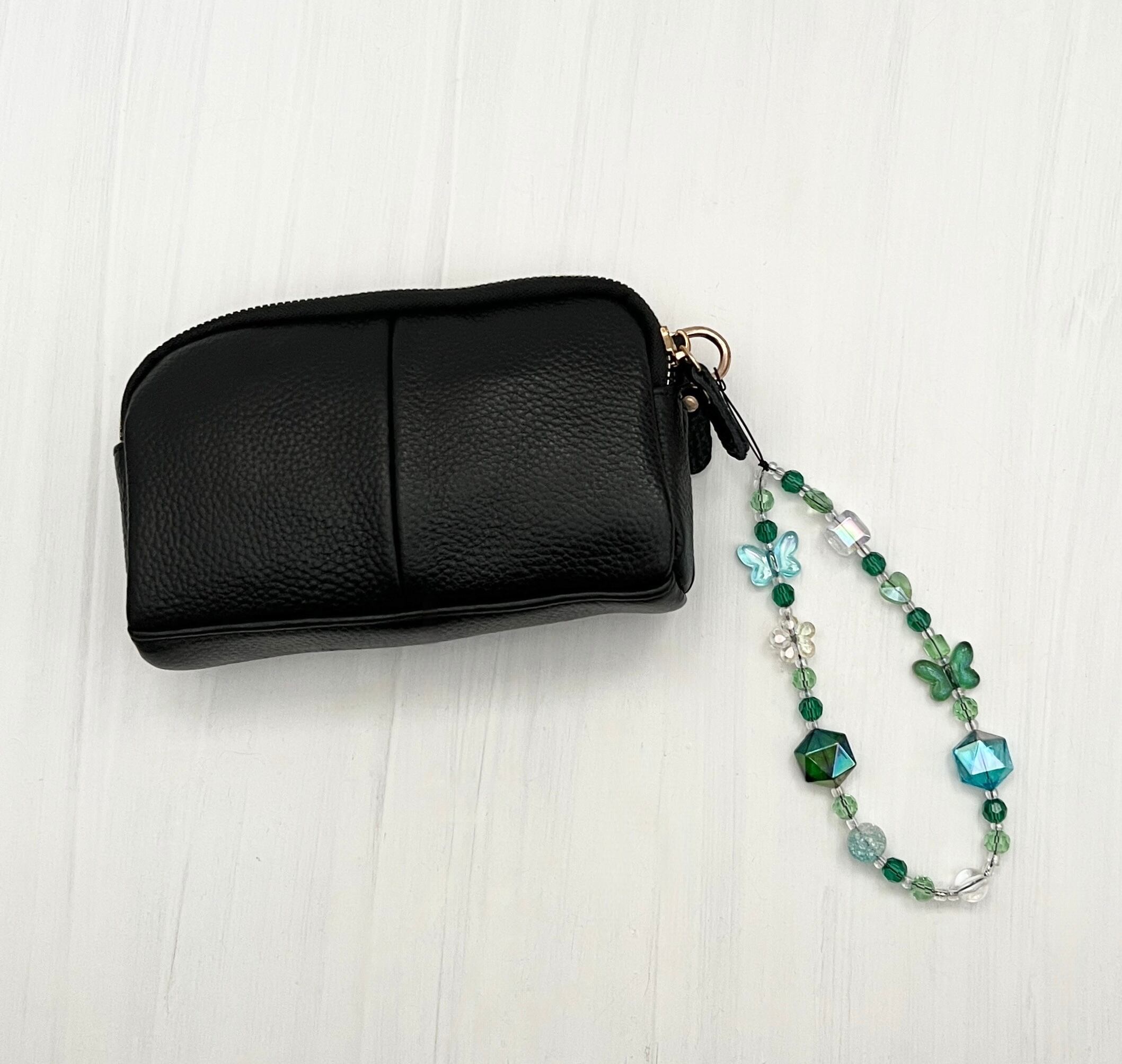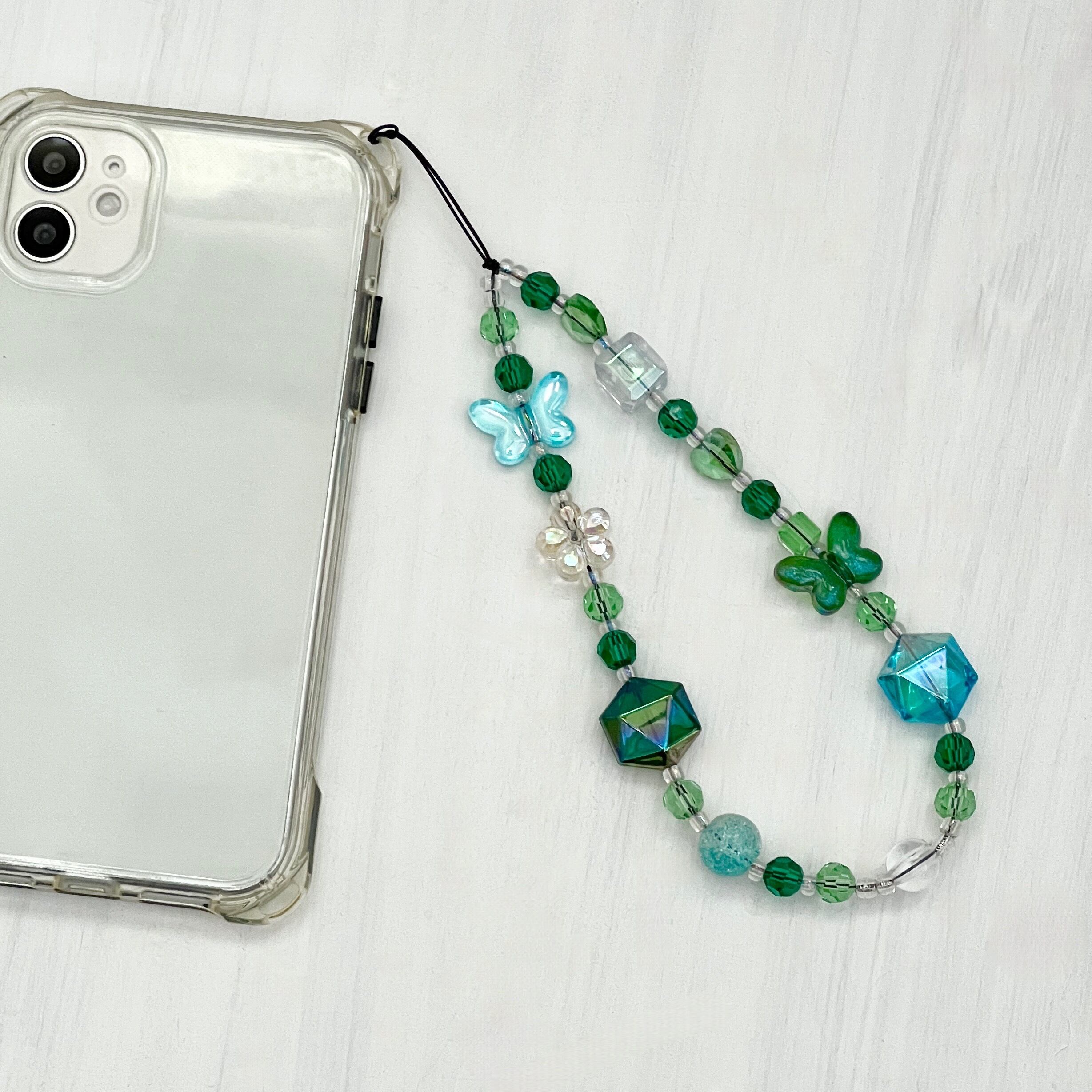 蝶々ビーズとお花のビーズのグリーンハンドストラップ