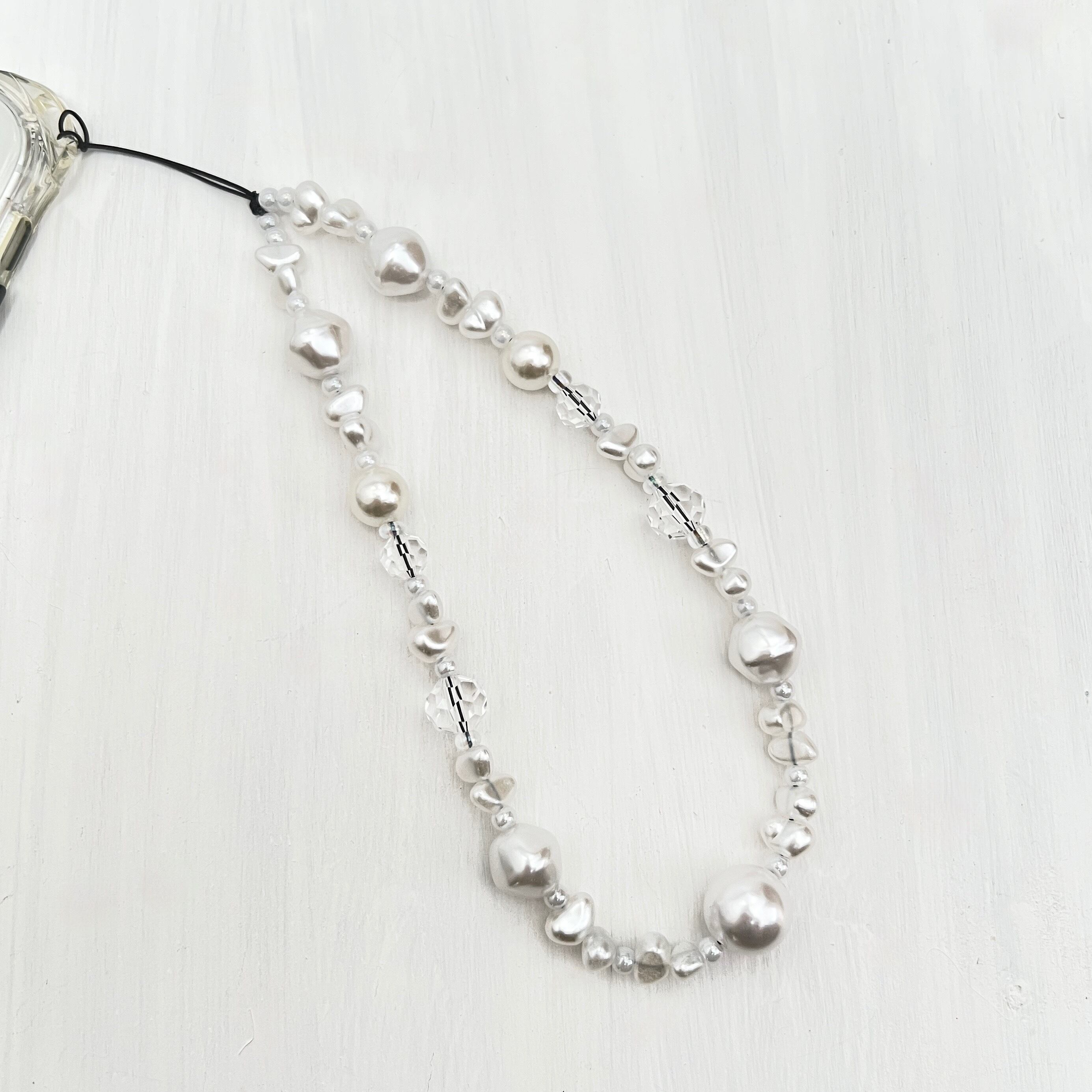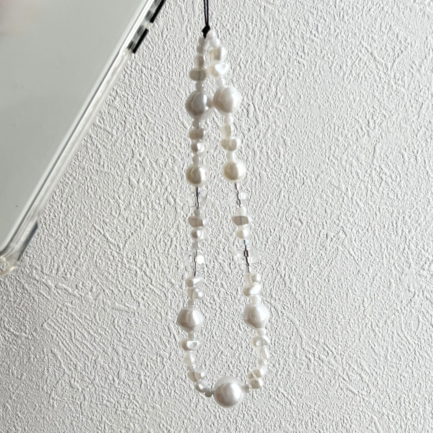 パールビーズの上品さとガラスビーズの輝きを組み合わせた、洗練されたデザインのビーズストラップ。