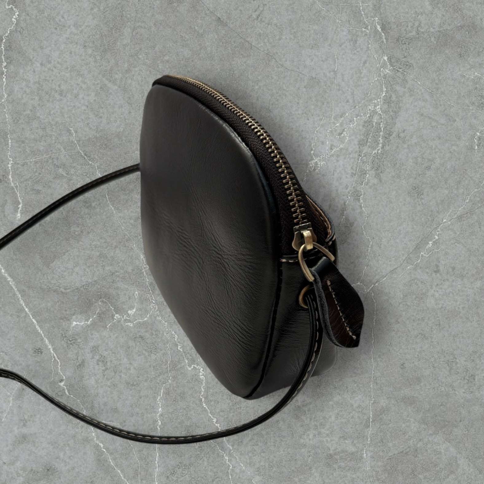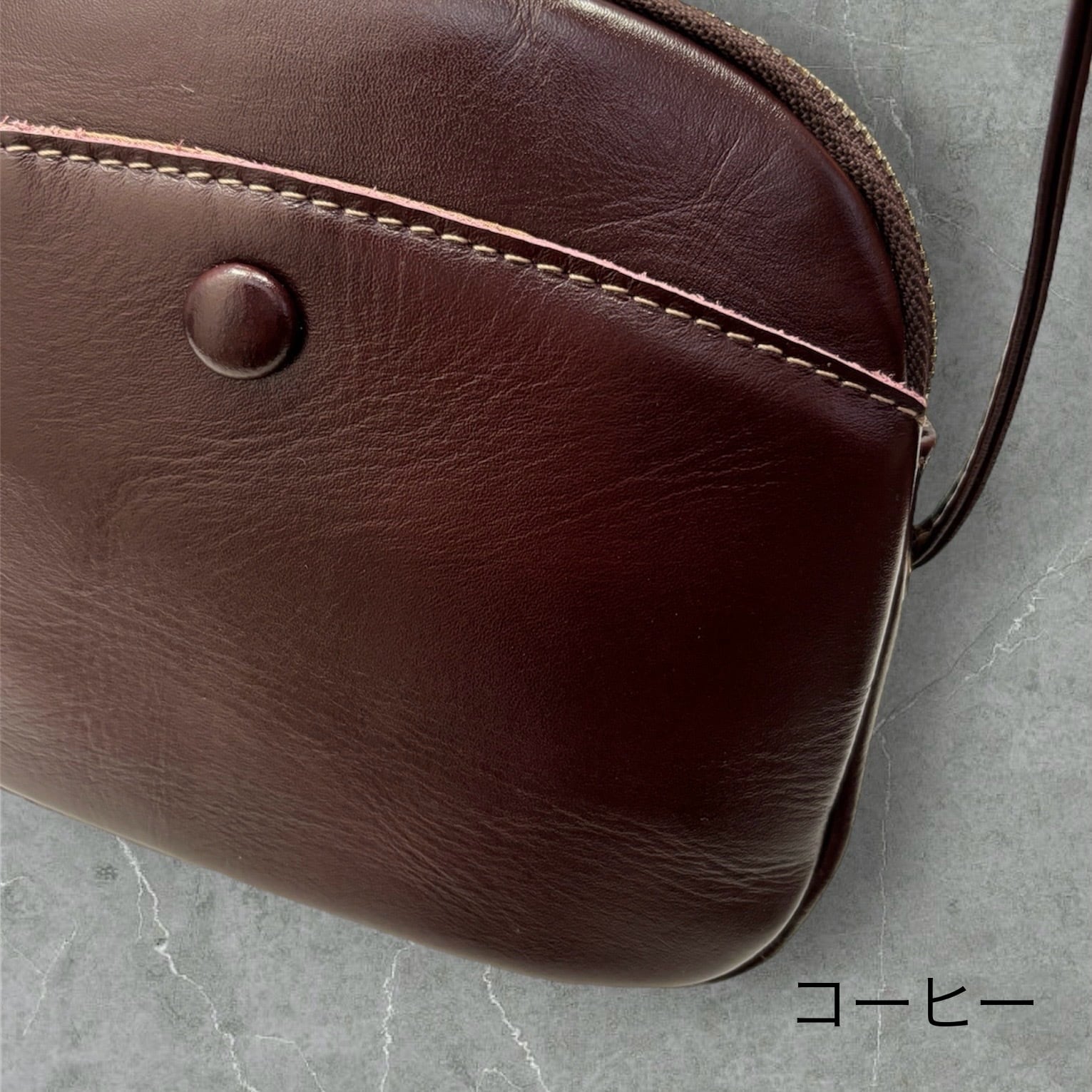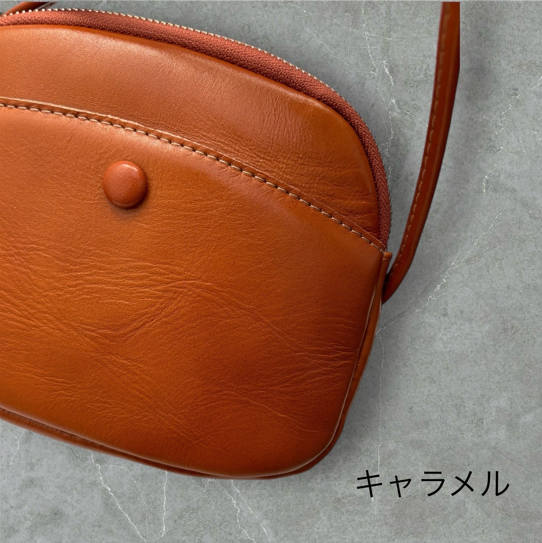 ころんとした丸いフォルムが愛らしい本革スマホポーチ。ファスナーの引手には葉っぱのデザインを取り入れ、自然の優しさと遊び心をプラス。上質な革と細部にこだわったデザインで、毎日のお出かけがもっと楽しくなるアイテムです。