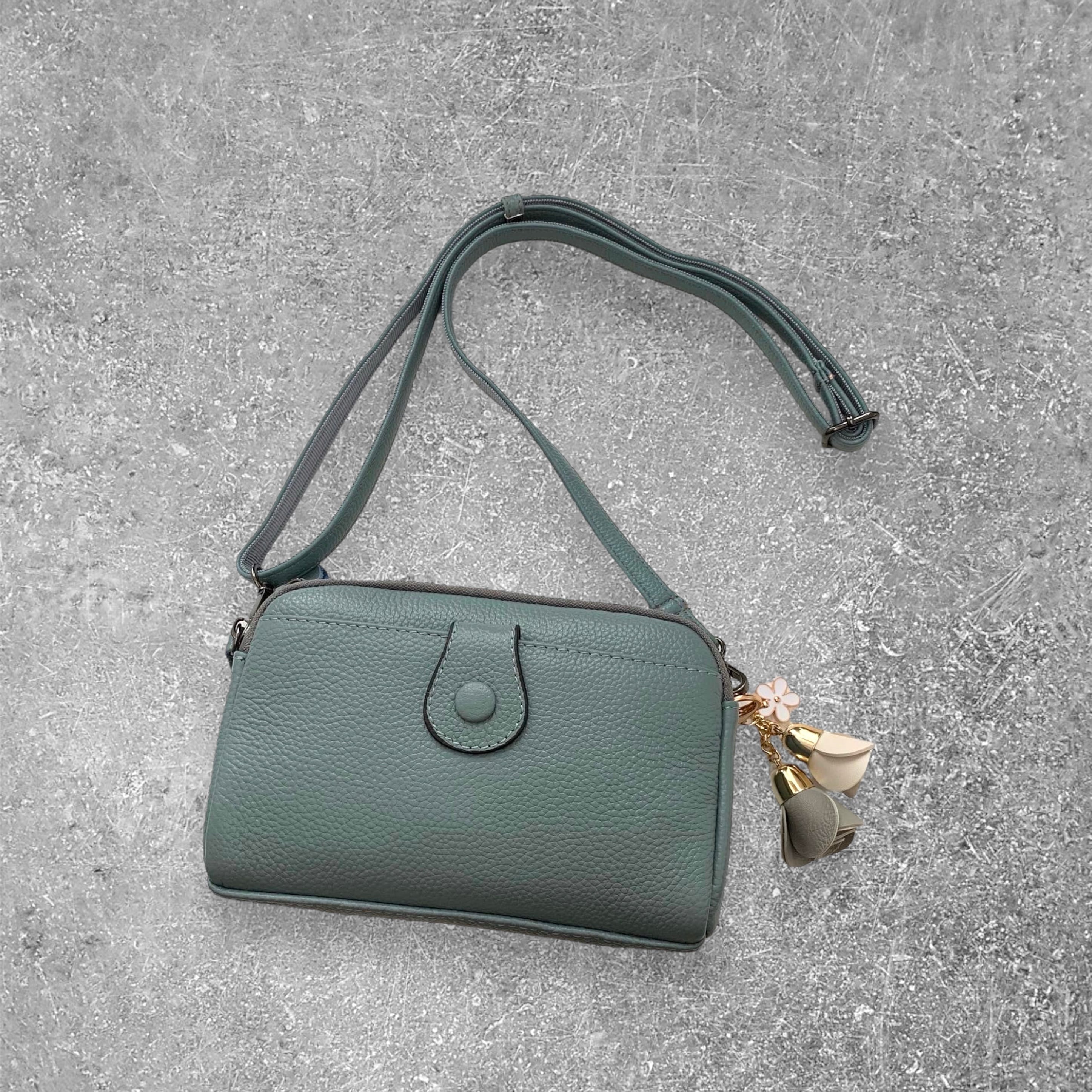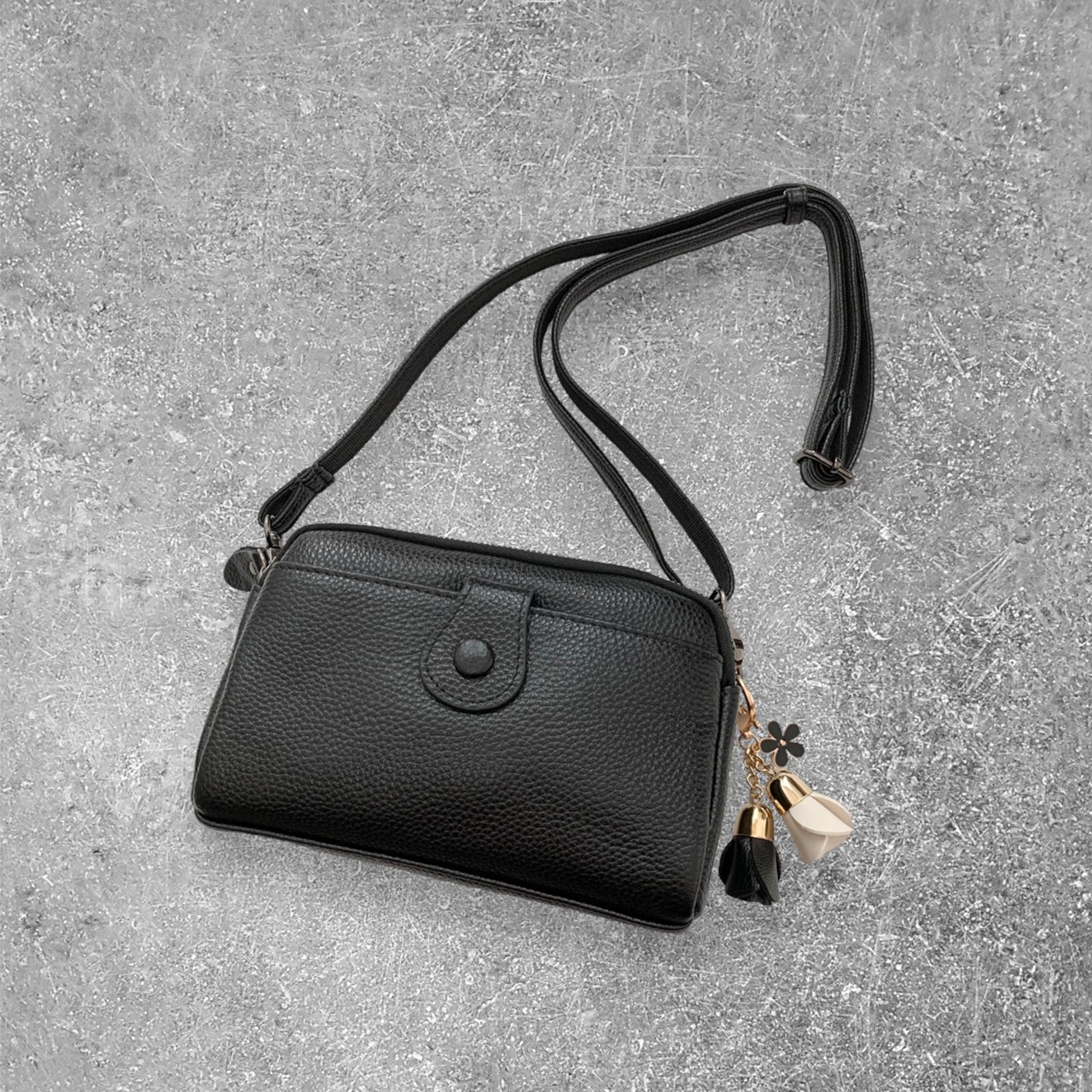 本革の小型スマホポーチです。スマホや折り財布、口紅などに程よいサイズ感で軽量なのでちょっとしたお出かけやお散歩、旅行などのサブバッグとして活躍できる小型バッグです。分別にも優れファスナーが外側に3カ所もあり、バッグの中で迷子になりがちな化粧品や財布、定期、カードなどの仕分けができ、定位置を決めれば取り出しやすく大変便利です。前面のポケットには定期、カード類などが入ります。