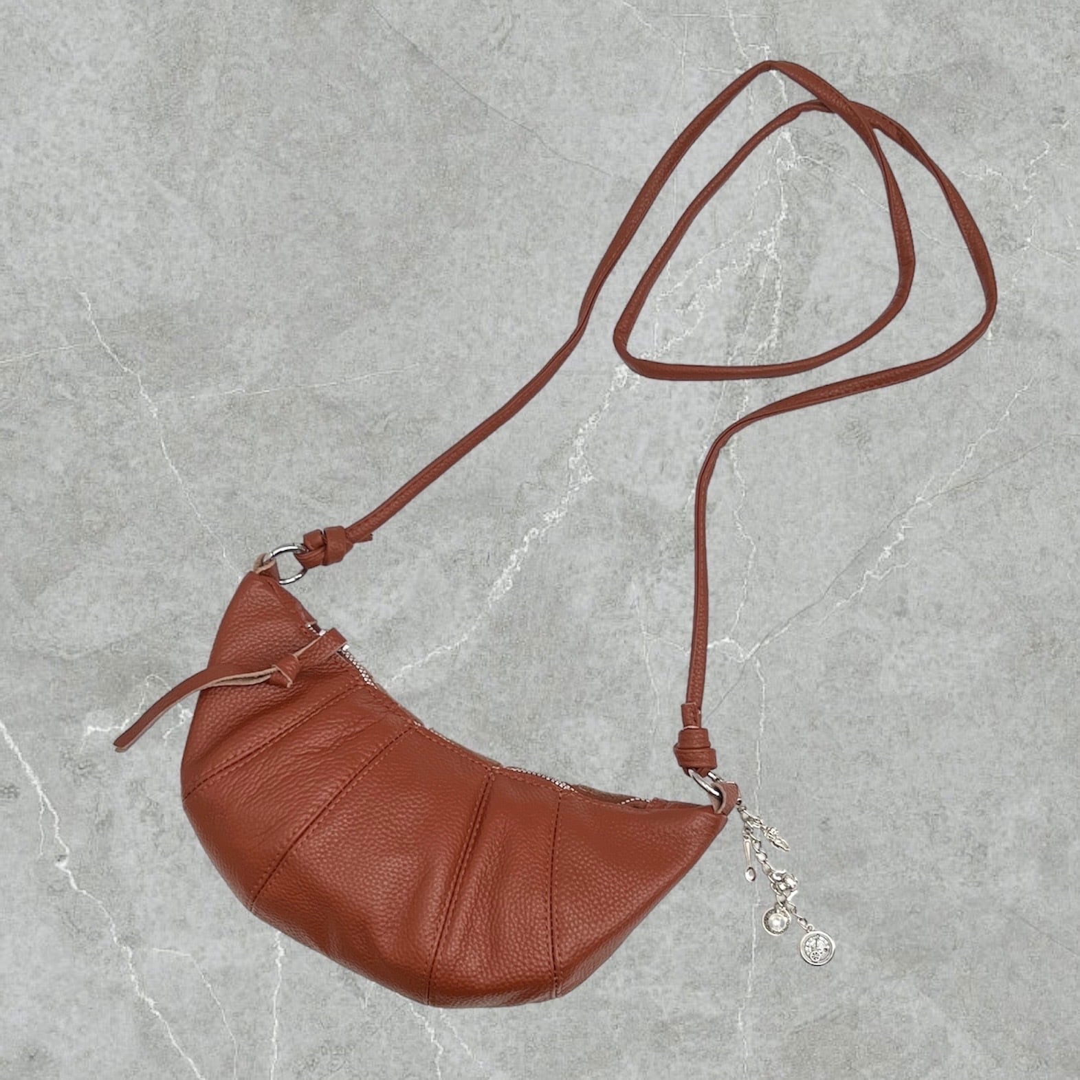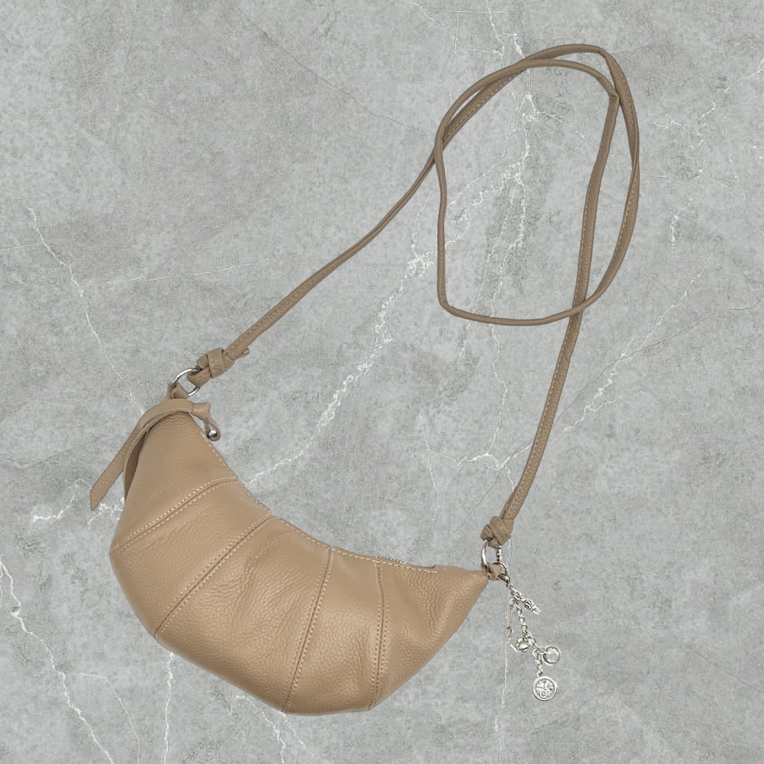 クロワッサン型の丸みを帯びたシルエットが、スタイリッシュで洗練された印象を与えます。シンプルながら個性を演出できるデザインです。スマホや折り財布、口紅などに程よいサイズ感で軽量なのでちょっとしたお出かけやお散歩、旅行などのサブバッグとして活躍できる小型バッグです。