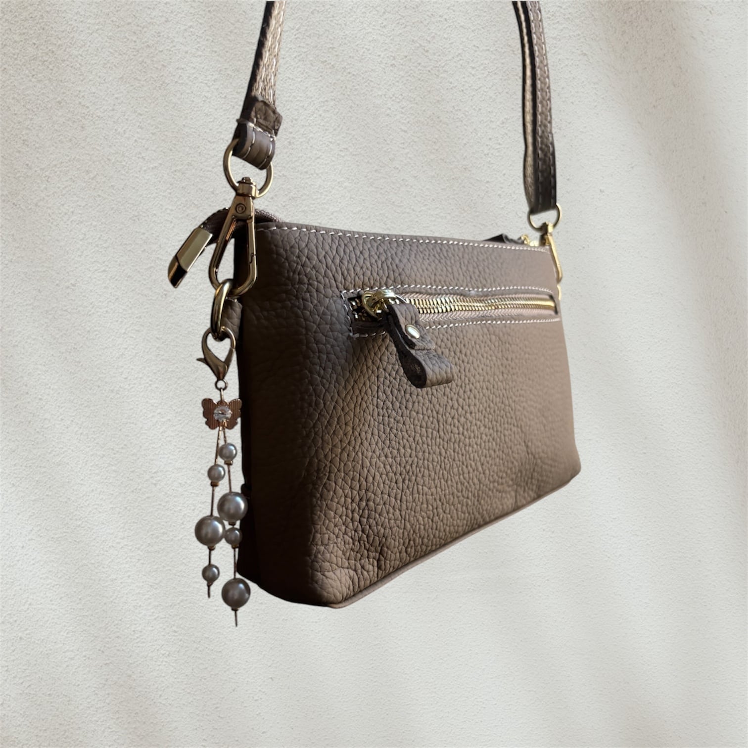 写真7枚目のオプションのパール&チェーンショルダーが特別感を醸し出し、高級感のある本革レザーが上品な印象を与えてくれます。