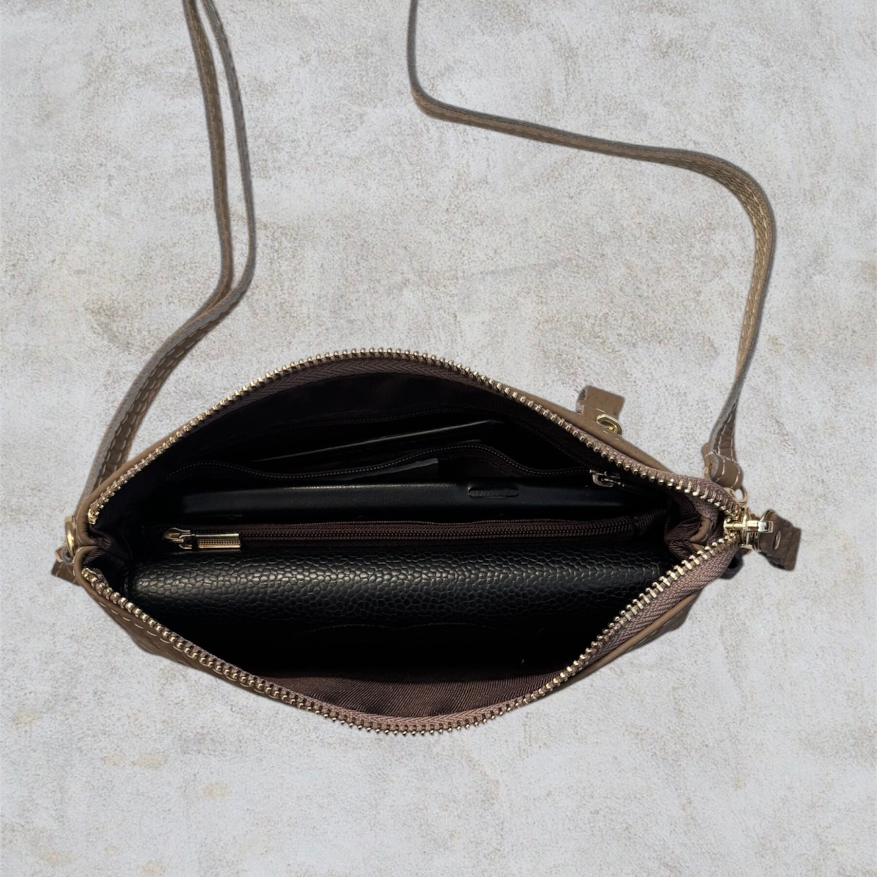 薄さで魅せる、機能で叶える。上質本革のスマートショルダーバッグ。 ファスナー付き仕切りポケットで安心収納。